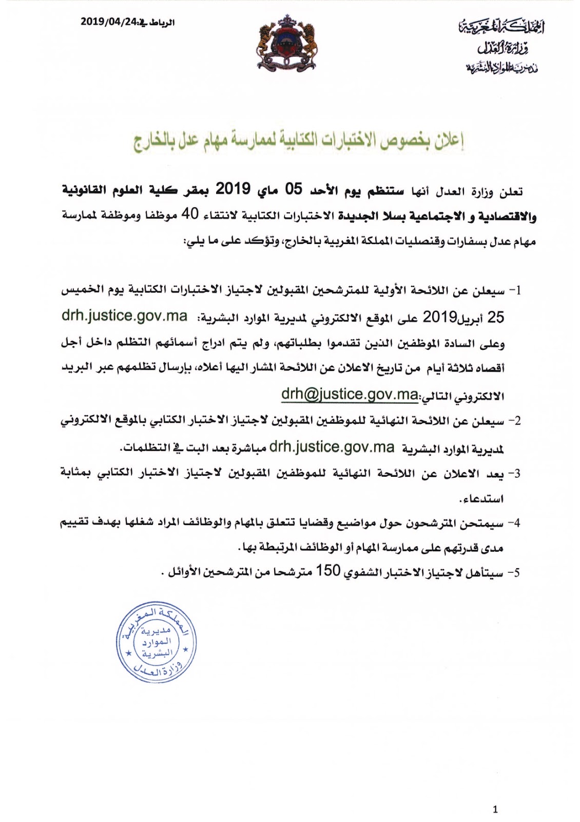 إعلان بخصوص الاختبارات الكتابية لممارسة مهام عدل بالخارج بالتوفيق للجميع