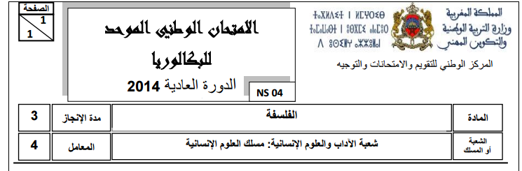 موضوع الامتحان الوطني الموحد للبكالوريا 2014 في مادة الفلسفة مع التصحيح -الدورة العادية-