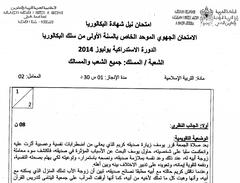 الامتحان الجهوي الأولى بكالوريا 2014 التربية الإسلامية جميع الشعب- الدورة الإستدراكية – جهة الشرق –