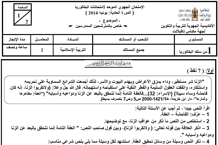 الامتحان الجهوي للبكالوريا 2014 في التربية الإسلامية الآداب والعلوم الإنسانية- الدورة العادية -جهة تادلة أزيلال