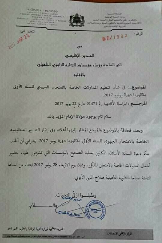أعلنت وزارة التربية الوطنية والتكوين المهني في بلاغ لها أنه سيتم الإعلان عن مداولات الدورة العادية للامتحان الجهوي الموحد للسنة الأولى من سلك البكالوريا دورة 2017 الخاص بالممدرسين يوم 28 يونيو 2017