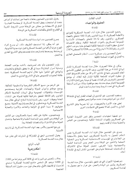 تم نشر الظهير الشريف المتعلق بتنفيذ القانون المتعلق بالخدمة العسكرية (أو ما يصطلح عليه بالتجنيد الإجباري)، وذلك بالجريدة الرسمية عدد 6746 مكرر بتاريخ 25 يناير 2019