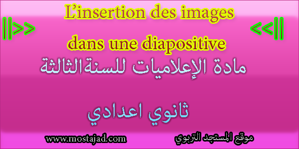 درس L’insertion des images dans une diapositive – l’image en mouvement درس في مادة المعلوميات L’insertion des images dans une diapositive – l’image en mouvement لتلاميذ السنة الثالثة من التعليم الثانوي الإعدادي. من إعداد: الأستاذة بشرى العلوي. الدرس ||>> فيديو توضيحي ||>> رابط للتحميل Downlaod درس L’insertion des images dans une diapositive – l’image en mouvement