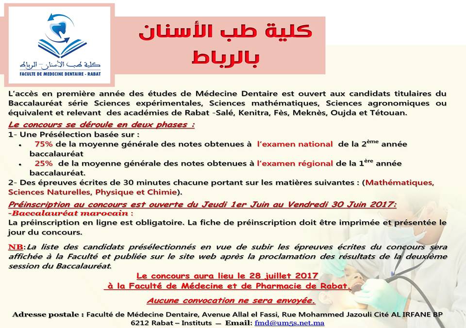L’accès en première année des études de Médecine Dentaire est ouvert aux candidats titulaires du Baccalauréat série Sciences expérimentales, Sciences mathématiques, Sciences agronomiques ou équivalent et relevant des académies de Rabat -Salé, Kenitra, Fès, Meknès, Oujda et Tétouan