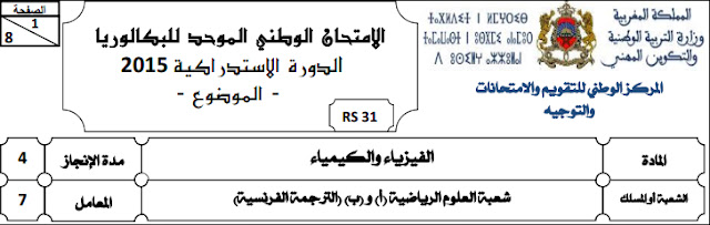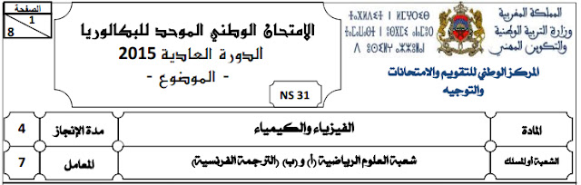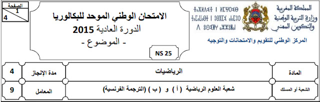 مواضيع الإمتحانات الوطنية لنيل شهادة الباكالوريا في مادة الرياضيات (الترجمة الفرنسية) مع التصحيح- نموذج 2015-الدورة العادية مسلك العلوم الرياضية أ و ب .