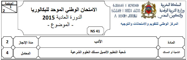 شعبة العلوم الشرعية : الإمتحان الوطني نموذج 2015 مادة الأدب مع التصحيح الدورة العادية