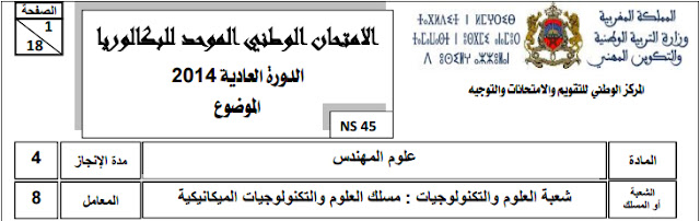 مواضيع الإمتحانات الوطنية لنيل شهادة الباكالوريا في مادة علوم المهندس مع التصحيح – نموذج 2014 – الدورة العادية مسلك شعبة العلوم والتكنولوجيات الميكانيكية .