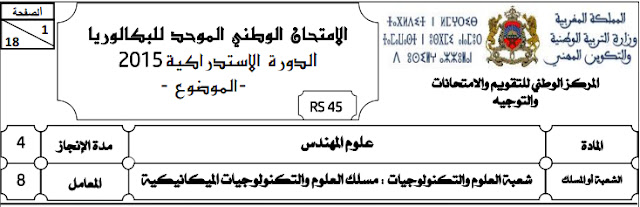 مواضيع الإمتحانات الوطنية لنيل شهادة الباكالوريا في مادة علوم المهندس مع التصحيح – نموذج 2015 – الدورة العادية مسلك شعبة العلوم والتكنولوجيات الميكانيكية .