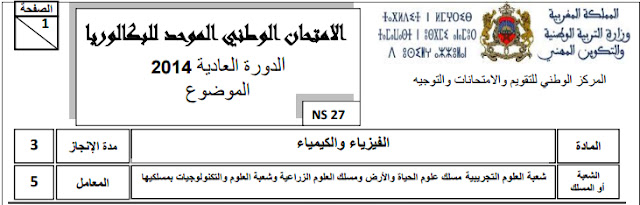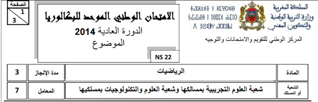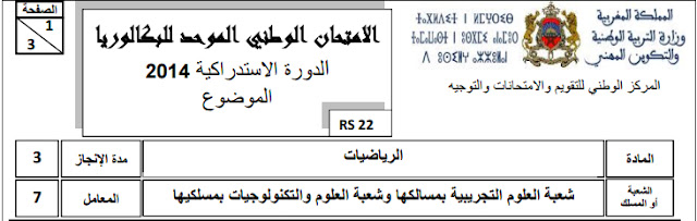 شعبة علوم الحياة و الارض :الإمتحان الوطني 2014 مادة الرياضيات مع التصحيح الدورة العادية