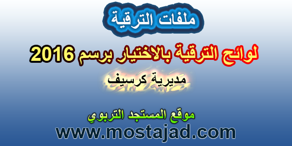لوائح الترقية بالاختيار مديرية كرسيف برسم 2016 ||>> التفاصيل: مراسلة الأستاذ فضولي ادريس بالتوفيق للجميع لا تنسونا بصالح الدعاء رابط للتحميل Downlaod لوائح الترقية بالاختيار مديرية كرسيف برسم 2016