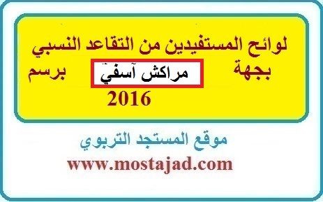 لوائح المستفيدين من التقاعد النسبي بجهة مراكش آسفي برسم 2016 حظ موفق للجميع للتحميل المرجو الضغط على الرابط أسفله: هنا