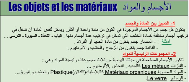 يتضمن درس الأجسام والمواد لتلاميذ السنة الثالثة من التعليم الثانوي الإعدادي المحاور التالية:- لتمييز بين المادة واالجسم.