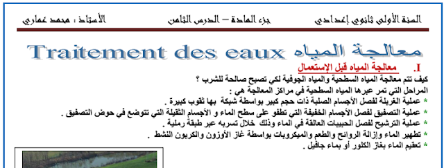 يتضمن درس معالجة المياه لتلاميذ السنة الأولى من التعليم الثانوي الإعدادي المحاور التالية: