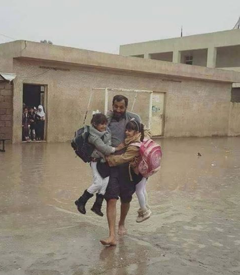 “انتشرت مؤخرا عبر الفايسبوك، صورة مؤثرة لأستاذ يساعد تلاميذه على عبور بركة مائية كبيرة تكونت داخل ساحة مدرسة بسبب التساقطات المطرية الأخيرة.