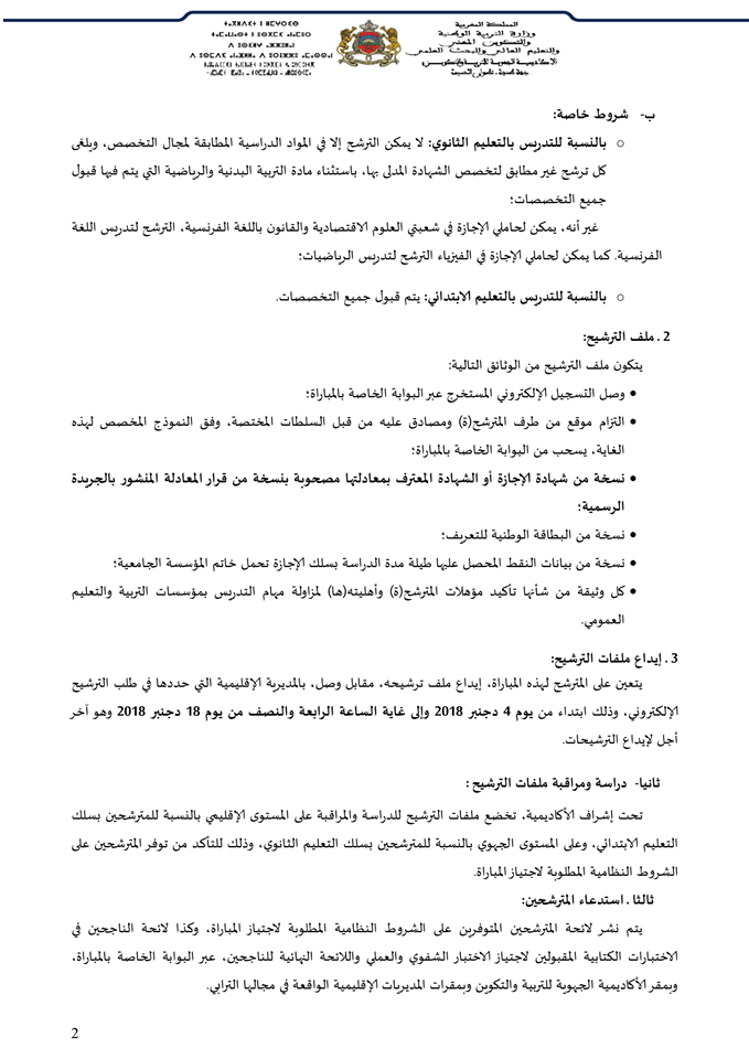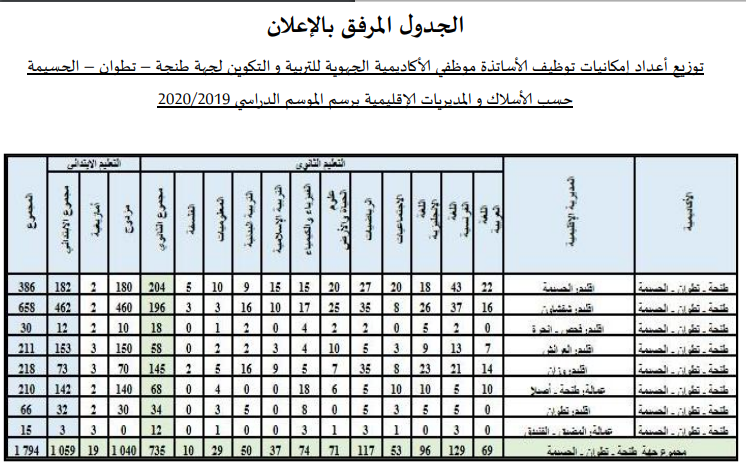 تعلن الأكاديمية الجهوية للتربية والتكوين لجهة طنجة تطوان الحسيمة عن تنظيم مباراة لتوظيف الأساتذة، عملا بمقتضيات النظام الأساسي الخاص بأطر الأكاديمية، وذلك يوم السبت 22 دجنبر 2018، حسب الأعداد والمواد المحددة في الجدول المرفق بهذا الإعلان.