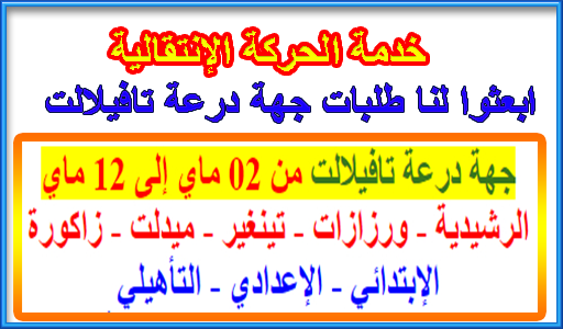 نخبر الإخوة الأعزاء أننا نستقبل أسماء المؤسسات و الجماعات الخاصة بجهة درعة تافيلالت للأساتذة الذين يرغبون في المشاركة في الحركة الإنتقالية و الذين يتوفرون على شرط ثلاثة سنوات .