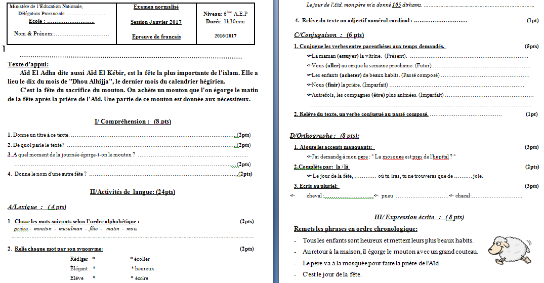 les questions et sujets d’examen normalisé local de la langue française pour la sixième année de l’enseignement primaire – la première session: Janvier 2016 accompagnés par des éléments de la réponse