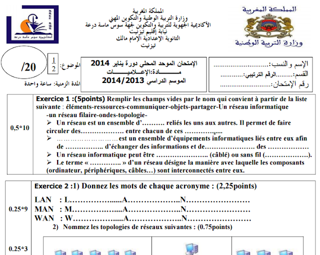 الإمتحان الموحد المحلي مادة الإعلاميات للثالثة ثانوي إعدادي (نموذج1)