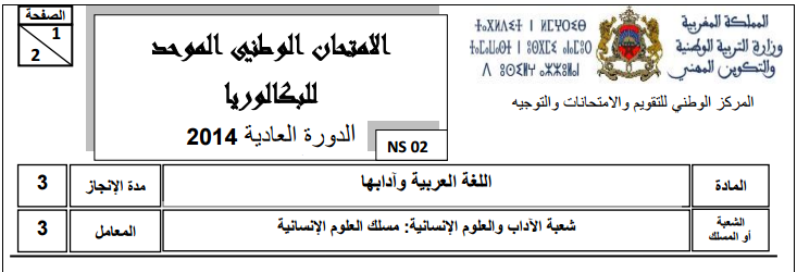 تحميل الإمتحان الوطني للثانية باك في مادة اللغة العربية 2014 – مع التصحيح