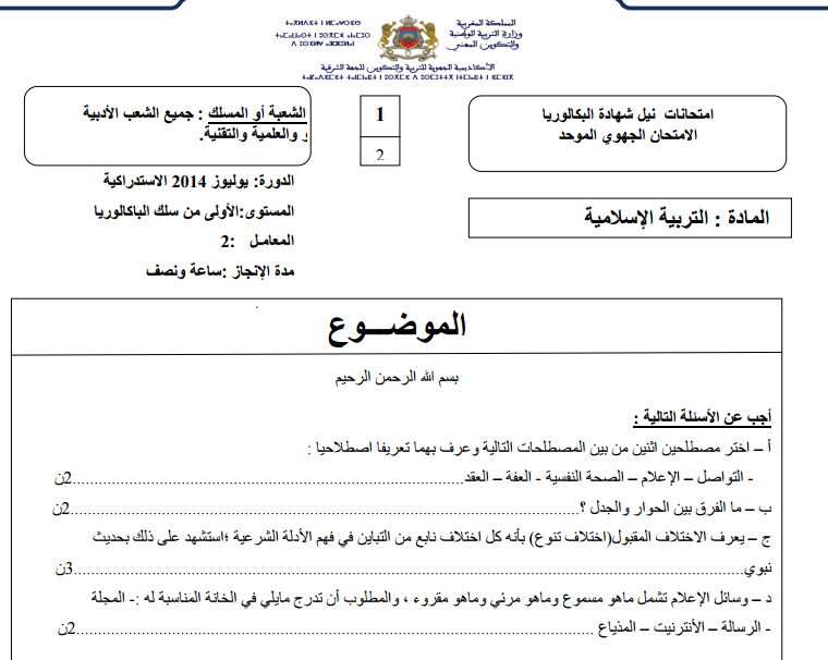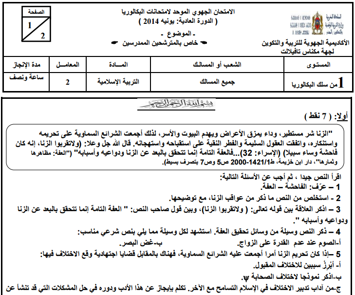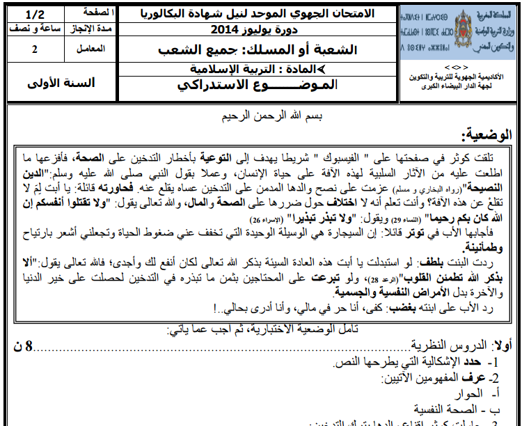 الامتحان الجهوي الأولى بكالوريا 2014 التربية الإسلامية جميع الشعب- الدورة الإستدراكية – جهة الشرق –