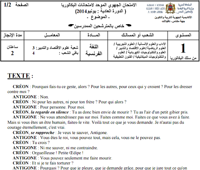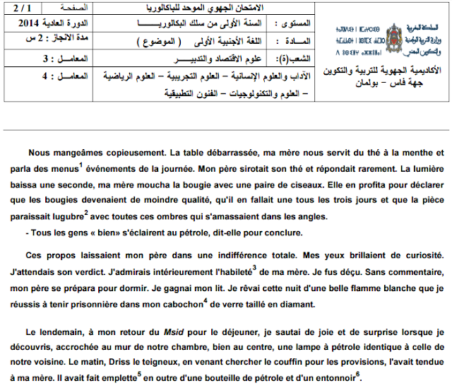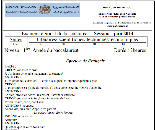 الامتحان الجهوي الأولى بكالوريا 2014 اللغة الفرنسية جميع الشعب- الدورة العادية – جهة الشاوية ورديغة