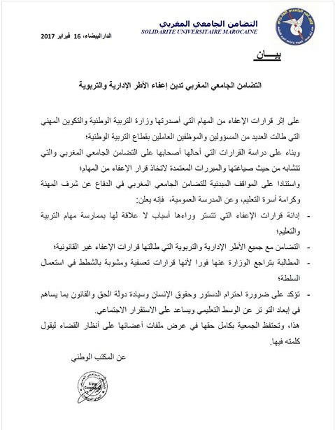 بيان التضامن الجامعي بخصوص الإعفاءات الأخيرة التضامن الجامعي يرد بقوة بخصوص الإعفاءات الأخيرة ...البيان