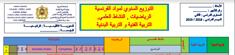 التوزيع السنوي لمواد الفرنسية, الرياضيات, النشاط العلمي, التربية الفنية والتربية البدينية