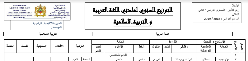 التوزيع السنوي لمادتي اللغة العربية والتربية الاسلامية