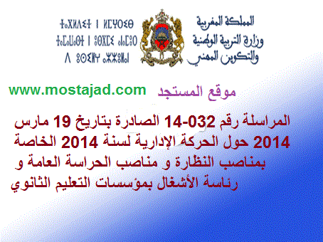 المراسلة رقم 032-14 الصادرة بتاريخ 19 مارس 2014 حول الحركة الإدارية لسنة 2014 الخاصة بمناصب النظارة و مناصب الحراسة العامة و رئاسة الأشغال بمؤسسات التعليم الثانوي المرجو الضغط هنا للتحميل