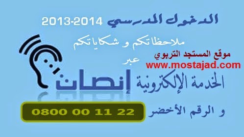 تعلن وزارة التربية الوطنية إلى عموم المواطنات والمواطنين أنها وضعت رهن إشارتهم ابتداء من يوم الأربعاء 17 شتنبر 2012 ، الخدمة الإلكترونية “إنصات” في نسختها الثالثة ، لتسجيل ملاحظاتهم و شكاياتهم بخصوص الدخول المدرسي 2015-2014.
