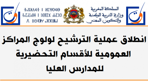 تنهي وزارة التربية الوطنية والتكوين المهني والتعليم العالي والبحث العلمي إلى علم جميع تلميذات وتلاميذ السنة الختامية من سلك البكالوريا (دورة 2022) أن عملية الترشيح لولوج المراكز العمومية للأقسام التحضيرية للمدارس العليا قد انطلقت عبر الموقع الإلكتروني www.cpge.ac.ma وستستمر إلى غاية 25 يوليوز 2017.