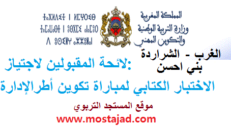 لائحة المترشحات والمترشحين لمباراة الدخول إلى سلك تكوين أطر الإدارة التربوية- دورة ماي 2015- الامتحان الكتابي المركز الجهوي لمهن التربية والتكوين الغرب الشراردة بني احسن