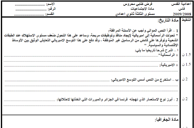 الفرض الأول مادة الإجتماعيات للثالثة إعدادي الدورة الأولى (نموذج 1)
