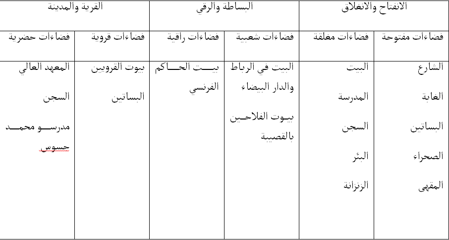 وهذه الأمكنة التي جرت فيها الأحداث وتحركت فيها الشخصيات في سيرة ليلى أبو زيد الذاتية، هي: القصيبة، وصفرو، والدار البيضاء، والرباط. وهي فضاءات عامة يمكن أن نميز داخلها بين مجموعة من التقاطبات المكانية باعتبارات مختلفة، كالانفتاح والانغلاق، والبساطة والرقي، والقرية والمدينة: