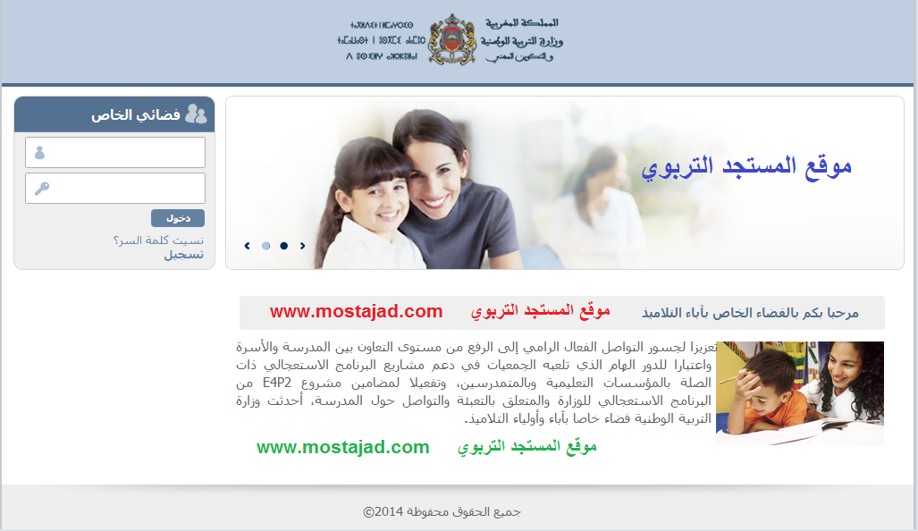 تعزيزا لجسور التواصل الفعال الرامي إلى الرفع من مستوى التعاون بين المدرسة والأسرة واعتبارا للدور الهام الذي تلعبه الجمعيات في دعم مشاريع البرنامج الاستعجالي ذات الصلة بالمؤسسات التعليمية وبالمتمدرسين، وتفعيلا لمضامين مشروع E4P2 من البرنامج الاستعجالي للوزارة والمتعلق بالتعبئة والتواصل حول المدرسة، أحدثت وزارة التربية الوطنية فضاء خاصا بآباء وأولياء التلاميذ.