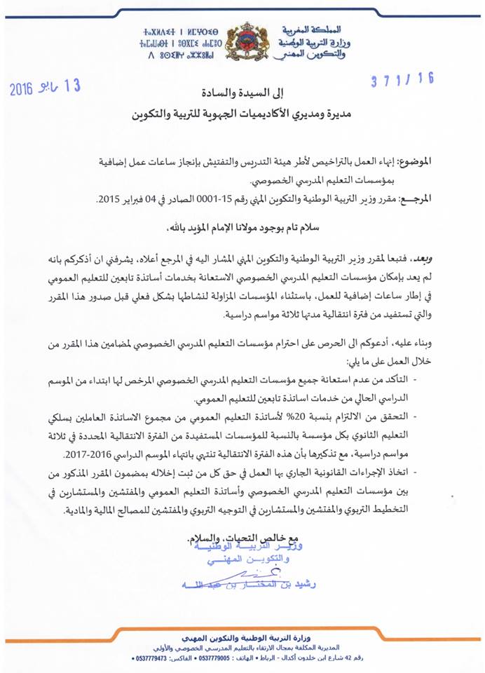 المراسلة الوزارية التي تنهي العمل بالترخيص لأطر هيئة التدريس والتفتيش بإنجاز الساعات الإضافية