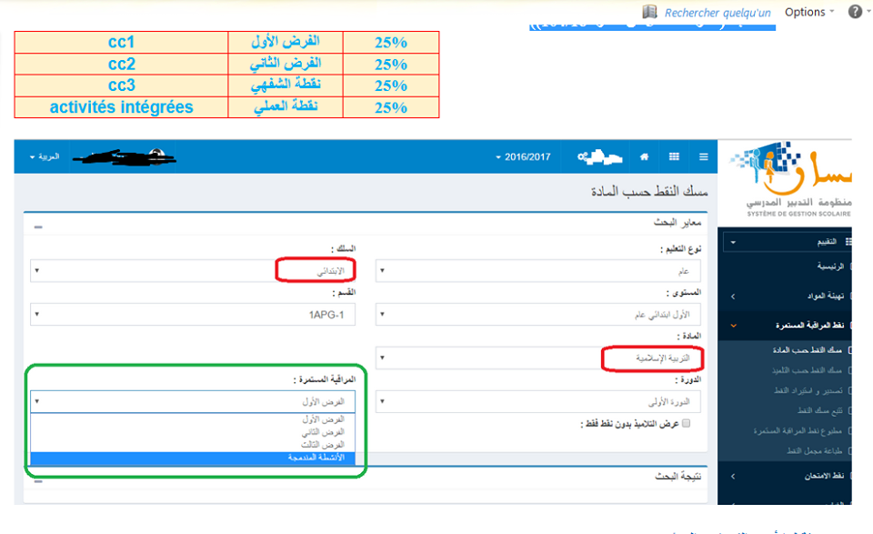 - – حساب المعدل والنقط (بالنسبة للابتدائي، أربع نقط في الأسدوس الواحد.