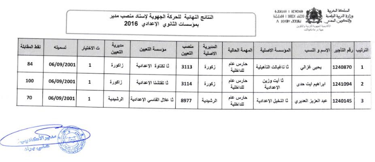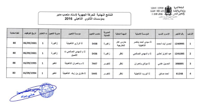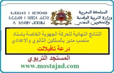 تحية طيبة اليكم النتائج النهائية للحركة الجهوية الخاصة باسناد منصب مدير بالسلكين الثانوي والاعدادي ومع ازكى التحيات.