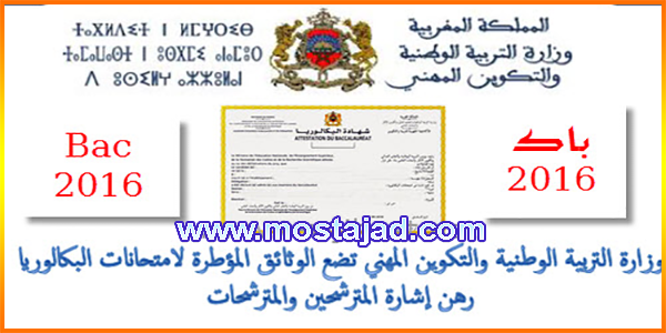 أعلنت وزارة التربية الوطنية والتكوين المهني في بلاغ لها بتاريخ 27 أبريل 2016 أنه في إطار مواكبة وتأطير المترشحين والمترشحات لامتحانات البكالوريا برسم دورة 2016، تمت موافاتهم عبر بريدهم الإلكتروني taalim.ma بكل الوثائق المؤطرة لهذا الاستحقاق التربوي الهام، والتي من شأنها، إضافة إلى مساعدتهم في التهييئ الجيد للاختبارات، من الاطلاع على كل الجوانب القانونية والتنظيمية وكل المستجدات الخاصة بامتحانات البكالوريا لدورة 2016.