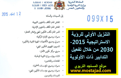 ويندرج إصدار هذه المذكرة في إطار التنزيل الأولي للرؤية الاستراتيجية للإصلاح التربوي 2015 -2030 التي أعدها المجلس الأعلى للتربية والتكوين والبحث العلمي، بما تضمنته من رافعات استراتيجية للتجديد، تروم ترسيخ مدرسة مغربية جديدة، تتجسد فيها مبادئ الإنصاف وتكافؤ الفرص، والجودة للجميع، والارتقاء الفردي والمجتمعي، وذلك من خلال تفعيل التدابير ذات الأولوية التي اعتمدتها الوزارة كبرنامج عمل مرحلي للانكباب على بعض الاختلالات الملحة للمنظومة التربوية، في التقائية وتناغم تامين مع مضامين الرؤية الاستراتيجية.