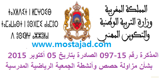 مذكرة الجمعية الرياضية المدرسية رقم 15-097 الصادرة بتاريخ 05 أكتوبر 2015 بشأن مزاولة حصص وأنشطة الجمعية الرياضية المدرسية