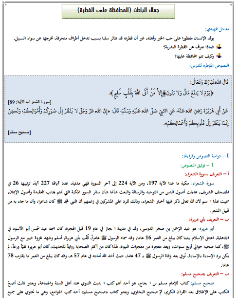 ملخصات دروس التربية الإسلامية الثالثة إعدادي -درس جمال الباطن (المحافظة على الفطرة)،ويتضمن المحاور التالية: