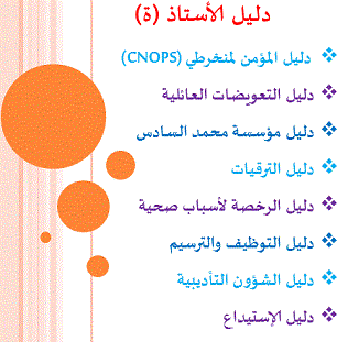 دليل المؤمن لمنخرطي (CNOPS) للتحميل من هنا دليل التعويضات العائلية للتحميل من هنا دليل مؤسسة محمد السادس للتحميل من هنا دليل الترقيات للتحميل من هنا دليل الرخصة لأسباب صحية للتحميل من هنا دليل التوظيف والترسيم للتحميل من هنا دليل التغيبات والانقطاعات عن العمل للتحميل من هنا دليل الشؤون التأديبية للتحميل من هنا دليل الإستيداع للتحميل من هنا