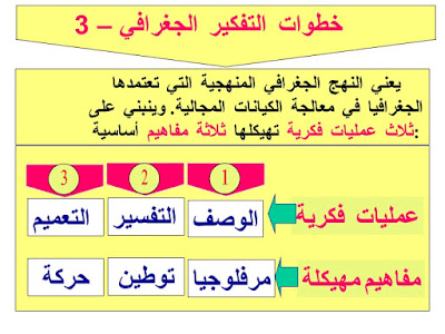 وعموما فالمنهج العلمي الجغرافي الحديث يتكون من ثاث عمليات فكرية مترابطة : الوصف ، التفسير و التعميم