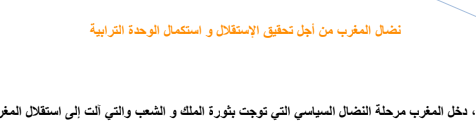 شهد المغرب خلال الفترة ما بين 1930 م و1953 مقاومة سياسية طالبت فيها الحركة الوطنية المغربية بالاصلاحات والمساواة مع الفرنسيين المقيمين بالمغرب، لكن رفض سلطات الحماية لهذه المطالب أدى إلى إندلاع المقاومة المسلحة إبتداءا من سنة 1953 فاسترجع المغرب إستقلاله ليخوض معركة إستكمال وحدته الترابية.