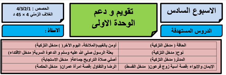 تقويم و دعم الوحدة الأولى مادة التربية الإسلامية للسادس ابتدائي