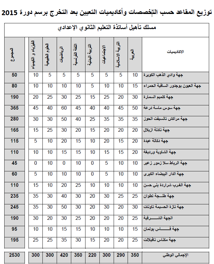 توزيع المقاعد حسب التخصصات وأكاديميات التعيين بعد التخرج برسم دورة 2015