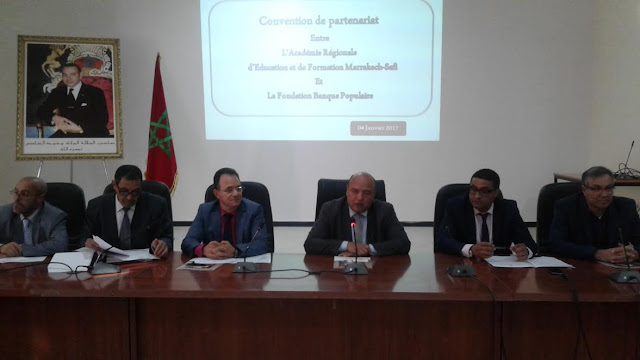 تم بمقر الأكاديمية الجهوية للتربية والتكوين مراكش آسفي، يوم الأربعاء 4 يناير 2017، توقيع اتفاقية شراكة من طرف السيد مولاي أحمد الكريمي، مدير الأكاديمية والسيد عبد اللطيف زخباط، الكاتب العام ل”مؤسسة البنك الشعبي”، وذلك بحضور السادة المديرين الإقليميين ومديرين من البنك الشعبي المركزي وفرعه الجهوي بمراكش وشركاء المؤسسة، إلى جانب السادة رؤساء الأقسام والمصالح بالأكاديمية ومديري ثانويتي الأقسام التحضيرية (ابن تيمية بمراكش ومولاي عبد الله بآسفي).