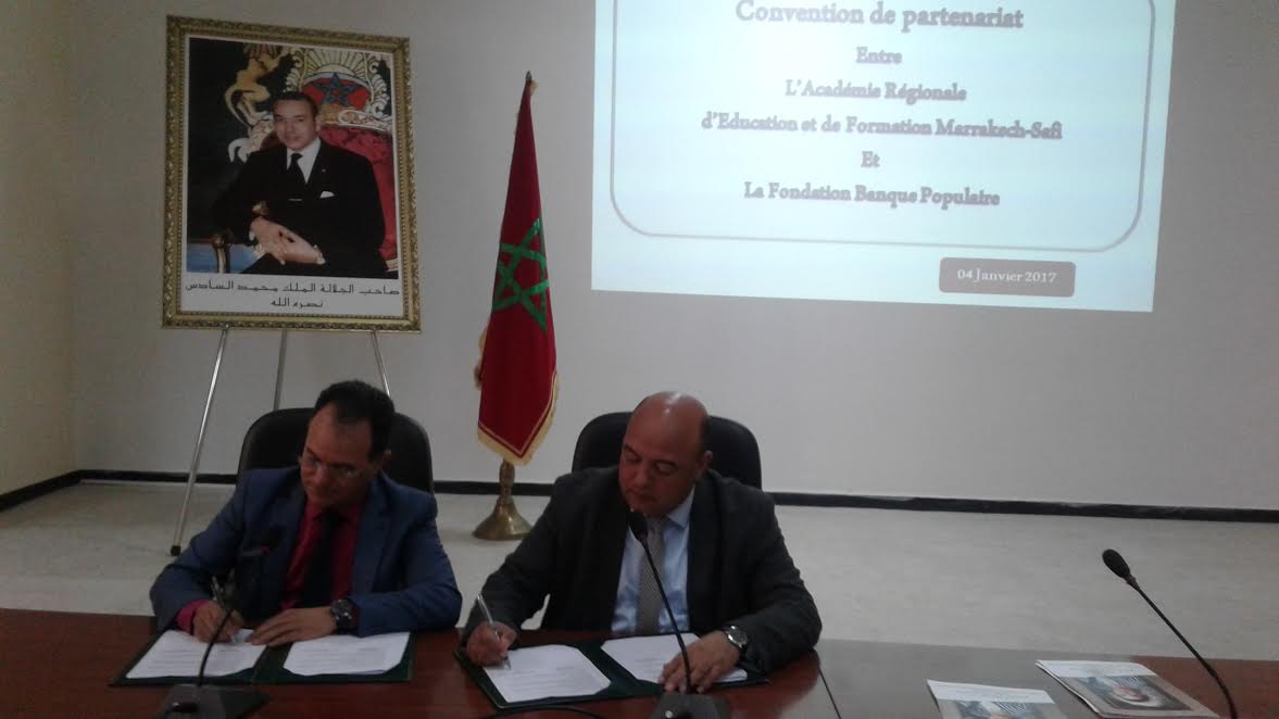 تم بمقر الأكاديمية الجهوية للتربية والتكوين مراكش آسفي، يوم الأربعاء 4 يناير 2017، توقيع اتفاقية شراكة من طرف السيد مولاي أحمد الكريمي، مدير الأكاديمية والسيد عبد اللطيف زخباط، الكاتب العام ل”مؤسسة البنك الشعبي”، وذلك بحضور السادة المديرين الإقليميين ومديرين من البنك الشعبي المركزي وفرعه الجهوي بمراكش وشركاء المؤسسة، إلى جانب السادة رؤساء الأقسام والمصالح بالأكاديمية ومديري ثانويتي الأقسام التحضيرية (ابن تيمية بمراكش ومولاي عبد الله بآسفي).