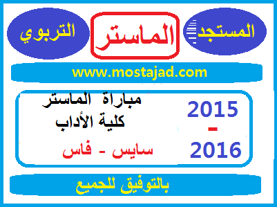 إعلان عن فتح مباريات ولوج مسالك الماستر برسم السنة الجامعية 2015 - 2016 لمعاينة إعلانات الماستر المفتوحة المرجو الضغط على الرابط أسفله: هنا